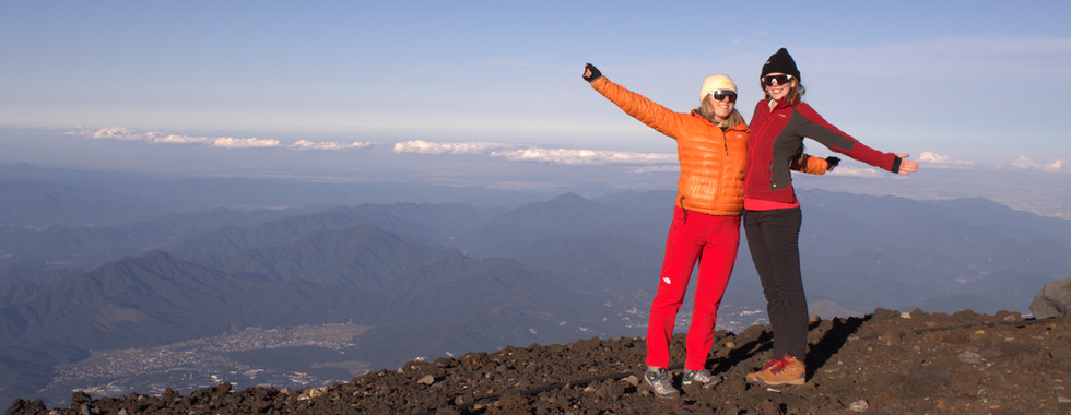 September, A few slides from Mt Fuji: breakfast with a view, a stop at a closed hut on the ascent, Ahna with her 'summit strongie', sunset views, and summit.